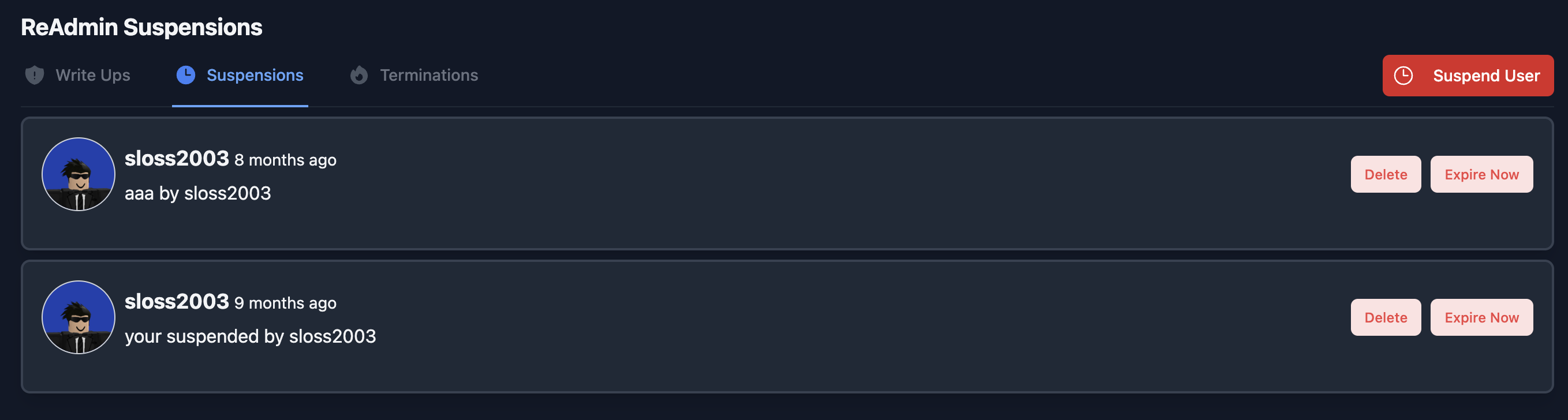 Suspensions are temporary punishments where the user can optionally be deranked (to be promoted once their suspension is over), expiry can be set, and like write ups can have evidence, notes, and optionally notify the user on Discord.