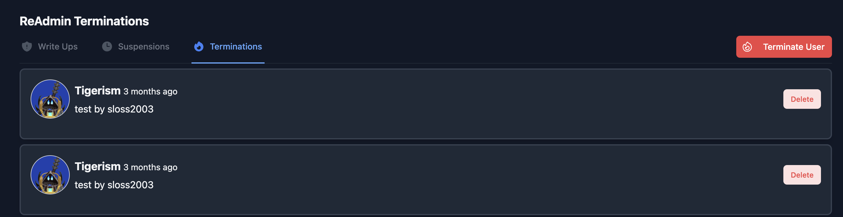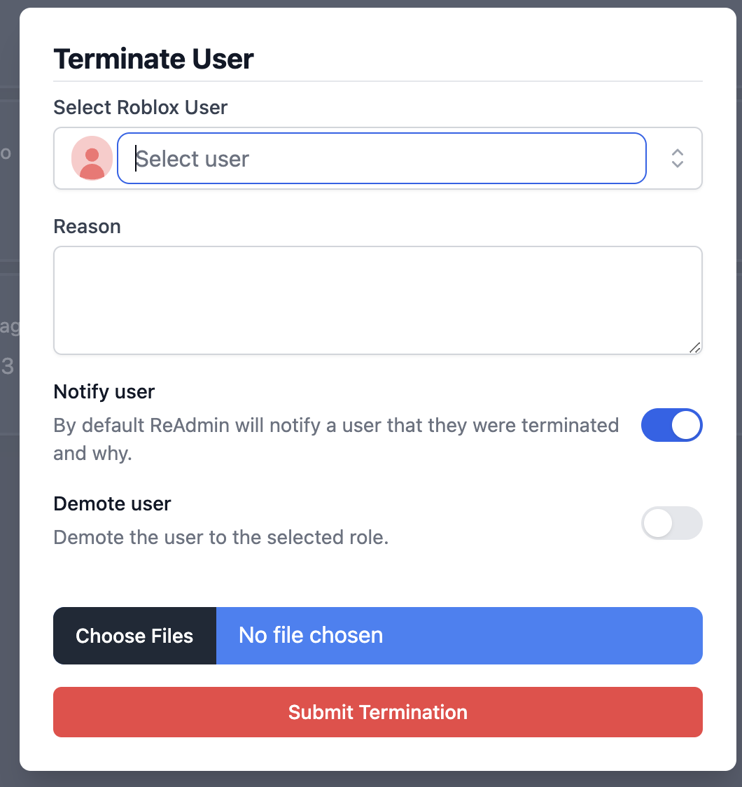 Terminations are when you’re fired. The user can be deranked, notified, and like write ups and suspensions evidence, notes, and notification options are available.