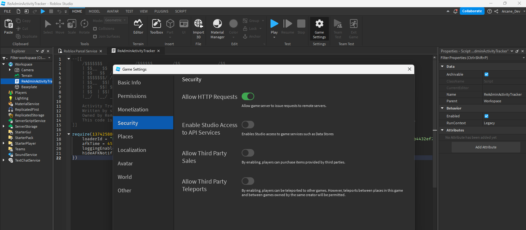 - One last thing for this to work, we have to enable HTTP requests for the game. Go to the top right and click on Game Settings. This is in the Home submenu. Navigate to Security and enable requests.