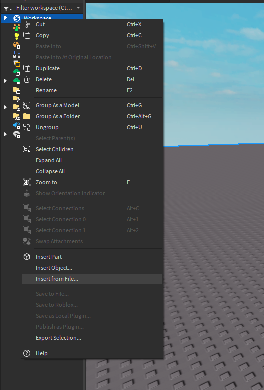 - Right click on the Workspace in Roblox Studio. Click “Insert from File” in the dropdown. Find the downloaded file from ReAdmin.